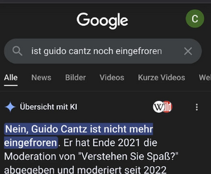 • UFO406 Hammse: Nachdem viele Leute "Guido Cantz eingefroren" gegooglet haben, soll nun "Guido Cantz aufgetaut" in den Suchergebnissen auftauchen.